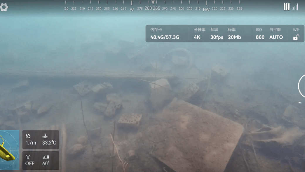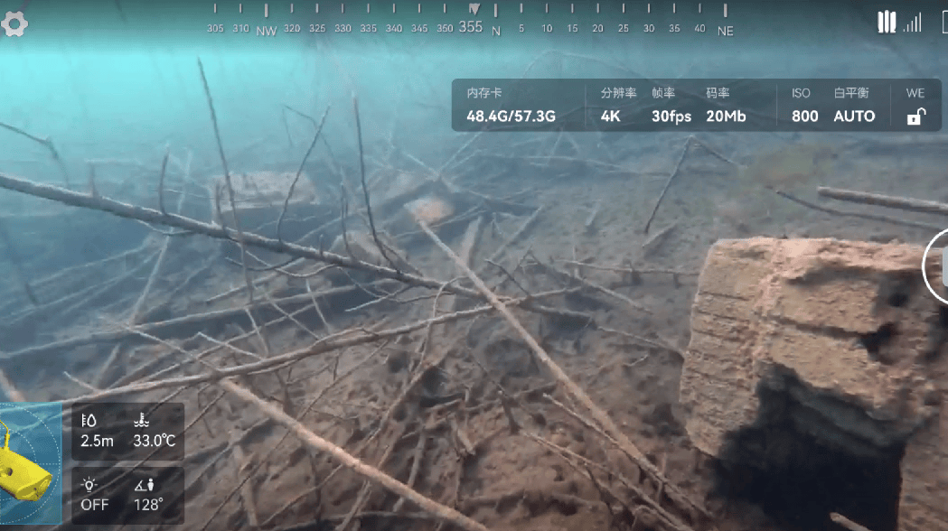 △水下机器东谈主拍摄水下画面,乱石杂木丛生