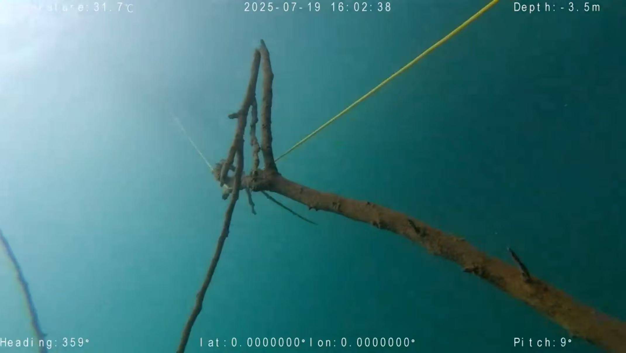 水下机器东谈主在牵引绳的箝制下在水中探索,水深之处如同见不到底的山地,探索历程中,水下机器东谈主的牵引绳还被树枝缠住了。