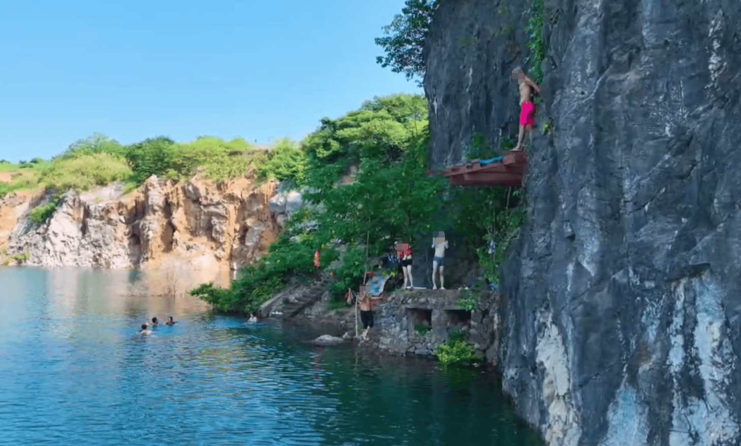 近日,部分市民在网上发布去到该矿坑跳水游水的视频,视频贯通,水面上有一个由疑似多个铁桶搭建的“平台”,各人站在岸边或该“平台”上一跃而下,跳入水中。